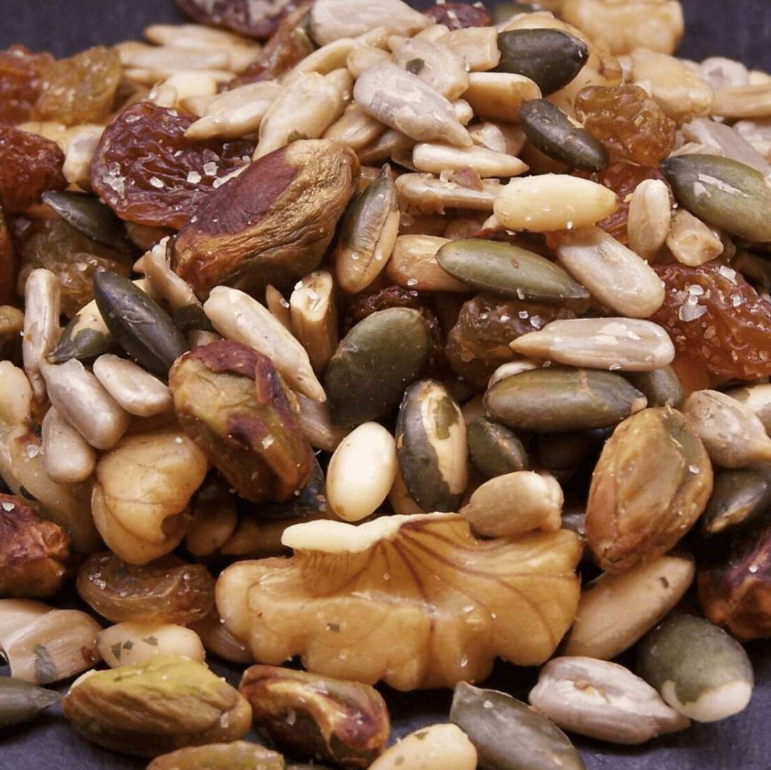 Suele contener pipas de calabaza fritas, pipas peladas fritas, piñón frito, pasas de irán, pistacho pelado frito y nueces peladas.